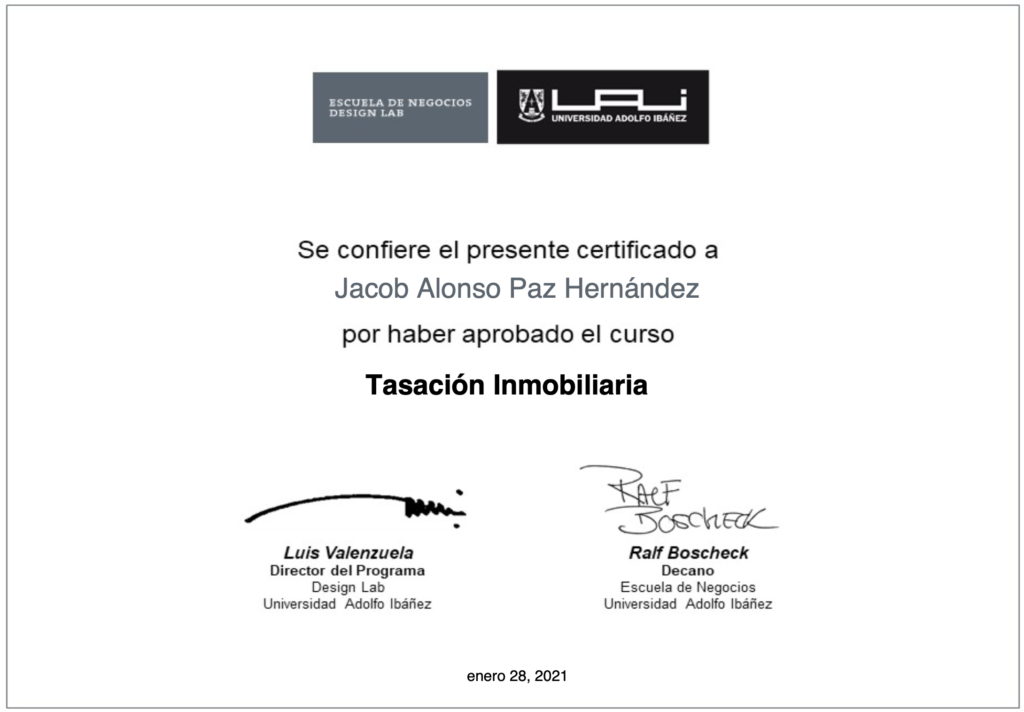 Jacob Paz, realizó sus estudios para obtener el título de tasador en la Universidad Adolfo Ibáñez el año 2020, obteniendo su diploma en enero de 2021. Durante años se ha dedicado a valorizar activos inmobiliarios, aplicando criterios específicos de acuerdo al encargo. Jacob principalmente realiza trabajos de tasaciones para particulares con enfoque en ventas , logrando explicar de manera...